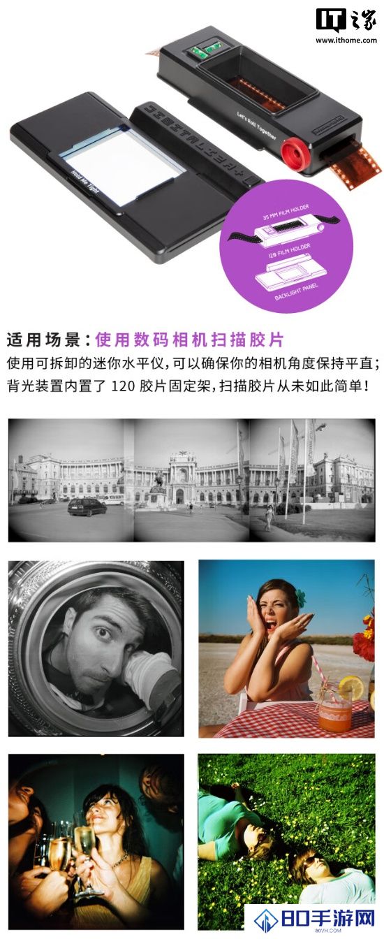 乐魔官方表示,该扫描匣可扫描 135、120 的胶片,110 或全景等规格的异形胶片也可扫描,只要带齿孔,就可以尝试固定并扫描;内置背光装置,背光光源为 LED,色温为 5500K-5600K,不可调节亮度,通过 2 节 5 号电池或 USB 线供电。
